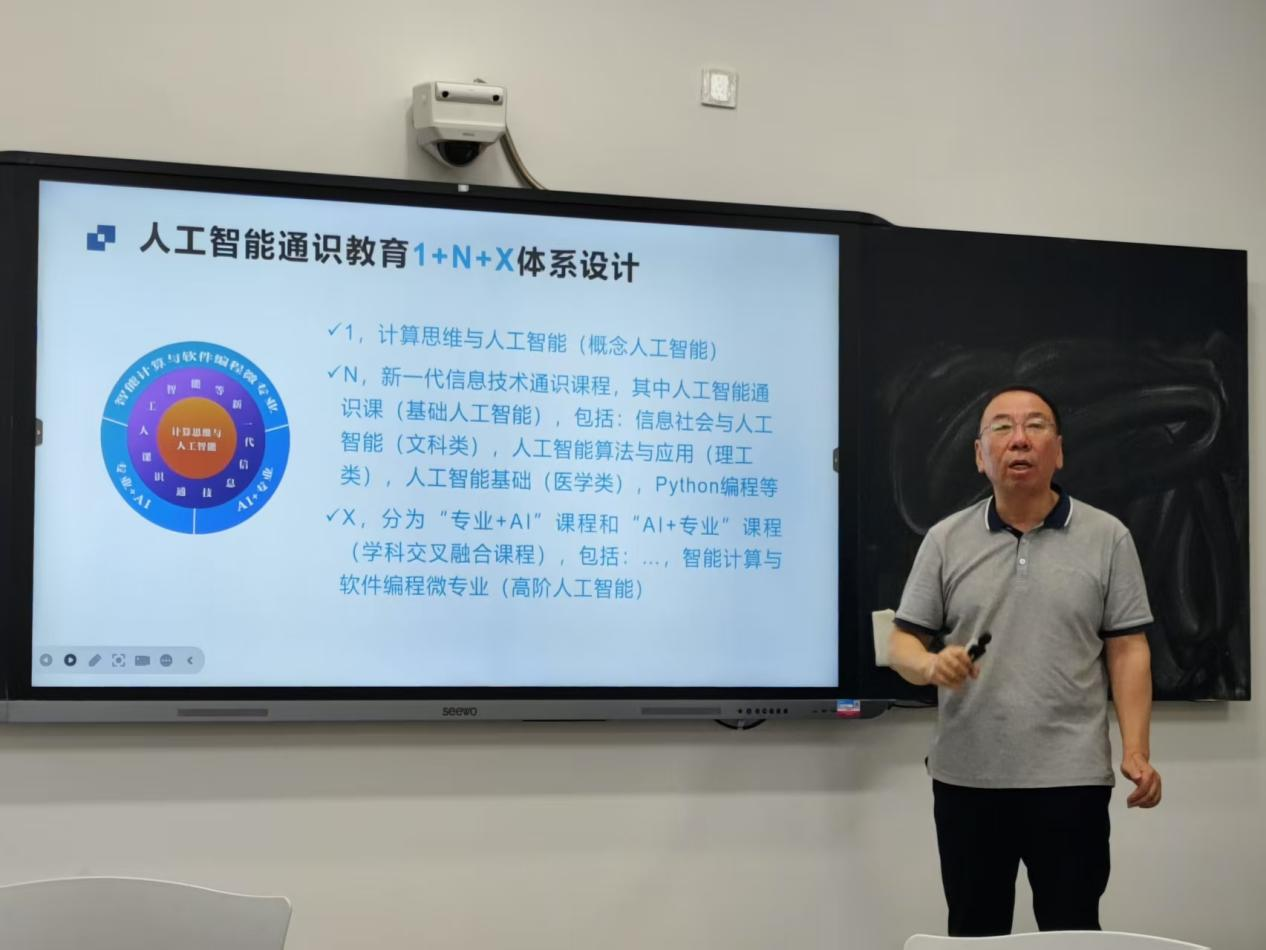 活动伊始,山东大学计算机基础教学研究中心主任、山东省教学名师、首届山东大学教学卓越奖获得者、教育部高等学校大学计算机课程教学指导委员会资深委员郝兴伟教授作题为《AI通识教育研究改革与实践》的主题报告。郝教授从高校人工智能教育的“两个维度”和“三个层次”切入,系统分析了非人工智能专业学生的培养体系,并分享了山东大学在《计算思维与人工智能》通识课程建设及“智能计算与软件编程”微专业中的实践经验。他强调,构建“概念-基础-高阶”分层教学体系是培养跨学科AI人才的关键。